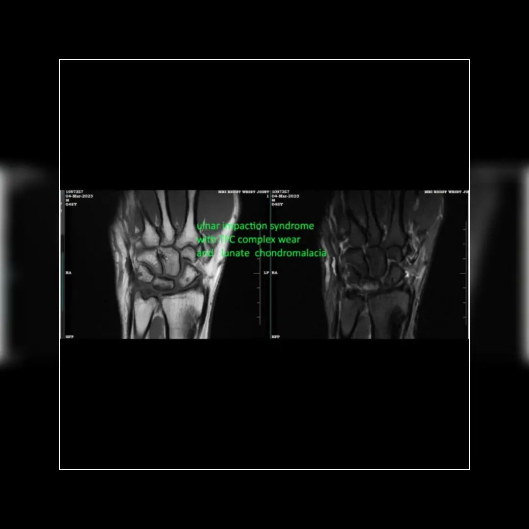 *Features suggestive of ulnar impaction syndrome with TFC complex wear and early lunate chondromalacia*