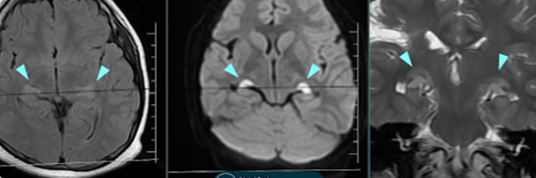 Gyriform restricted diffusion on DWI involving left insular cortex and medial temporal cortex (not well...