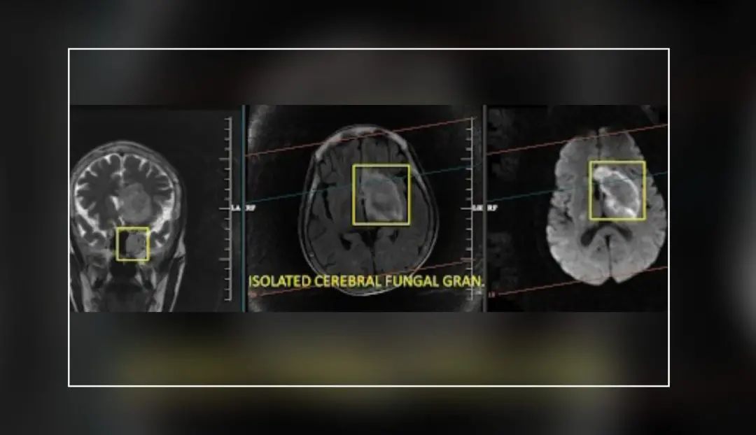 An extensive altered signal intensity lesion involving left capsuloganglionic region, thalamus, corona radiata and adjoining body and genu of corpus callosum with blooming on GRE –*suggestive of an isolated cerebral fungal granuloma with hemorrhagic transformation*